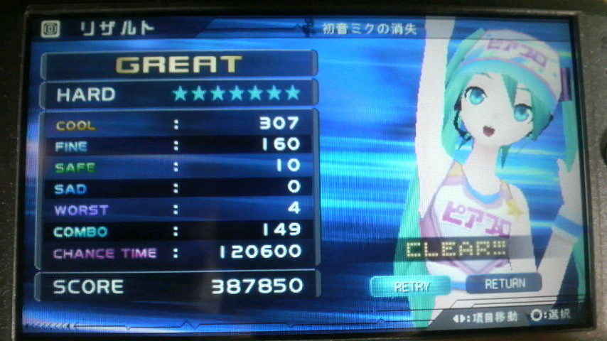 とりあえず今までのリズムゲームとは若干違うので勝手がわからないというか、リズムとかタイミングとか本気でわかりにくいです。聞いたことない曲ならなおさら。ついでにいうならボタンを追うのに一生懸命で、ミクのダンスなんて目に入りません・・・(笑)。あとでPVモードで見直さないとなぁ。