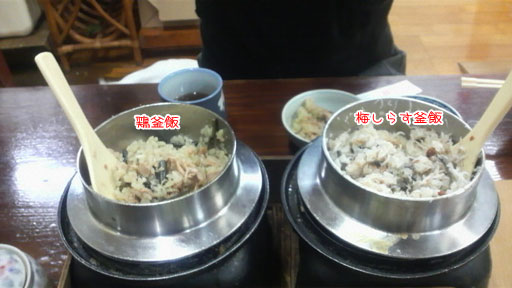さて、釜飯。なんかすごーい素朴なお店。入ってメニューを見てみたらかなりお手ごろ。わーい、と喜んで友人と1種類ずつ選んでみると、目の前に準備された釜。お店のおばあちゃんがかるーく「タイマーがなったら食べごろですからね~」と。はてさて、どれくらいでできるの?