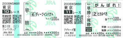 えーっと。日曜日。ジャパンカップ、行くなら連れてけーと友人にお願い?してまた競馬場に行ってきました。ディープ!ディープ!そこまで好きだー!というわけじゃないですが、やっぱりすごいなーとひたすら感心。つか、デジカメムービー撮るの必死で走ってるとこじっくり見れなかったヨ。でも、しんがりから全頭抜いて1着ってほんとすごいっすね。というわけで写真は当たり馬券。たいした金額つきませんので、お持ち帰りしてみました。でもって隣は次のレースに出てたお馬さんの馬券。がんばれ!ってなってるのが気に入ってます。これもさりげなく当たり馬券っぽいですが、まぁ、複勝でついてる金額だからそんなにはならないかな。ちなみに、このお馬さんはずいぶん前に行ったときに名前で気に入って買ったらまんまと勝ち馬になって、100円が2000円に化けたお馬さんです。今回は一番人気だった。何度も言いますが私は「予想する」とは程遠い馬券の買い方をするので(名前が気に入ったら買う)、当ると馬券が手元に残らないってのがなんとも微妙な気持ちになるわけですよ。それこそ、8レースのセイウンマルとか9レースのアルヴィレオとか。くそう、まさか来るとは思わなかったぜ・・・(笑)。そんなんですが十分楽しめました。おもしろかった!