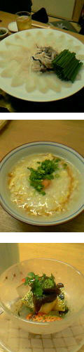 ふぐって聞くと、やっぱり刺身を箸でがーっとやるイメージがあるんですが(最近、旬だということもあるらしく、その光景をよくTVで見るんですよ・・・)、そんな贅沢なことできません。1枚ずつで十分おいしいです・・・。おいしかった。おいしかったー!写真はふぐ刺しとふぐ雑炊と最後に食べたみつまめ(ふぐ関係ない)なんですが、これの他に焼きふぐとか、からあげとか、鍋とか!ものすごく堪能してきました。おいしかったー!焼きふぐがめちゃめちゃ上手かったです。ごちそうさまでしたー☆これで多分一生ふぐを食べなくても生きていける・・・(え?)