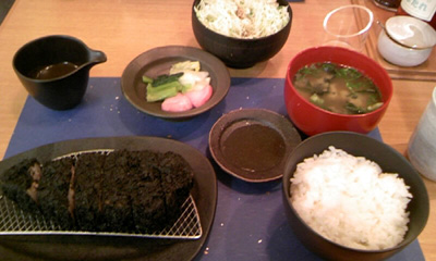 戸塚に真っ黒いトンカツを出すお店があるとテレビでやってたらしく、おもしろそうだったので友人と共に食べに行ってきました。ほんとに黒い!なんでも食用の竹炭が衣に混ぜられてるそうです。身体にいいとか、どんな味とかそういう説明はまったくありませんでしたが(笑)。なんでも、昭和初期?のころに横浜で真っ黒いトンカツを出すお店があったとかでそれの再現だそうな。ふーん。