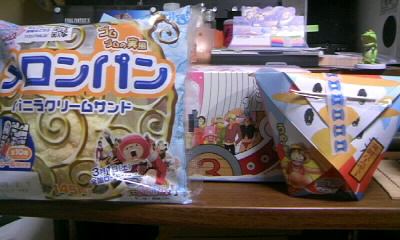 見にくくてメンゴー。ローソン商品で、2月1日に発売したメロンパンとからあげくん(バーベQ味)、後ろにさりげなくサニー号のティッシュボックスです。この状態でレジにいったら、バイトの兄ちゃんに失笑されたよ。いやもう、開き直ってるから別にいいんだけどね。ってこんだけわかりやすい買い方してんのに、くじ引かせるの忘れてくれたので、「くじ引かせて頂戴。」とせびってきました。もう当分あのローソンには行きたくないな。(つか行けないな)