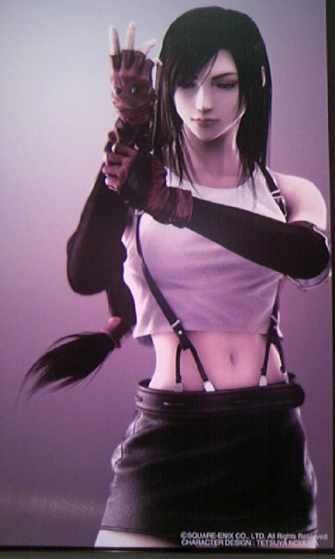あとはまぁ個別に言うのであれば一番最初のクラウドは片割れがいないわよーとか(先に公開されてるCGには後ろにセフィロスがいました)、このティファがすっごい漢(おとこ)前だな~とか、ヴィンだけ全身なのはなぜ?とか、ユフィとバレットが2枚ずつあるのに、シドとヴィンは1枚なんだーとか(これは、衣装が代わり映えしないからなのか・・・?)、ザックスは仔犬バージョンのがかわいいとか、社長がきれいなのは嬉しいんですが、できれば眼帯希望(どんな趣味だ)とか・・・そんな感じでしょうか。あ、スロープ写真は全員撮ったつもりでヴィンちゃんが切れてました。メンゴー!