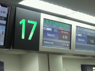 予約の都合もあって、早朝始発便で行くことに。6時50分発札幌行き。アタイ、けっこう早い時間の便に乗ることありましたけど、6時台は初めてだー・・・。時間を調べたら、地元からでは始発電車に乗らないと間に合わない。しかもそれ逃したらギリなんてもんじゃない。これは乗り遅れたりできません、ということで前の晩は寝れたのかどうかよく覚えてません。とりあえず真っ暗な中出発です。いや、問題なく着いてくれてよかったー。(実は前日、前々日と、東海道が始発あたりで遅延勃発続きだったのです・・・)